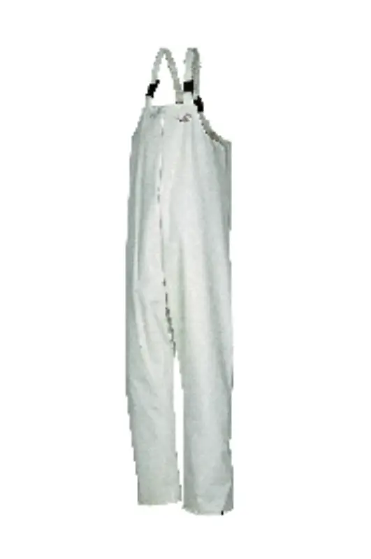 Omkeerbare bavetbroek / 100% waterdicht / Winddicht / Soepel / Elastisch / Comfortabel / Lichtgewicht / Geluidsarm / Duurzaam / Wasbaar op 95°C / Hoog frequent gelaste naden / Buitenkant: Elastische bretellen met gespen voor- en achteraan / Beenvernauwing d.m.v. drukknopen / Stof: FLEXOTHANE® Kleen: / 100% polyamide 6.6 breisel met PU coating; ± 170 g / m² Kleur: W02 wit