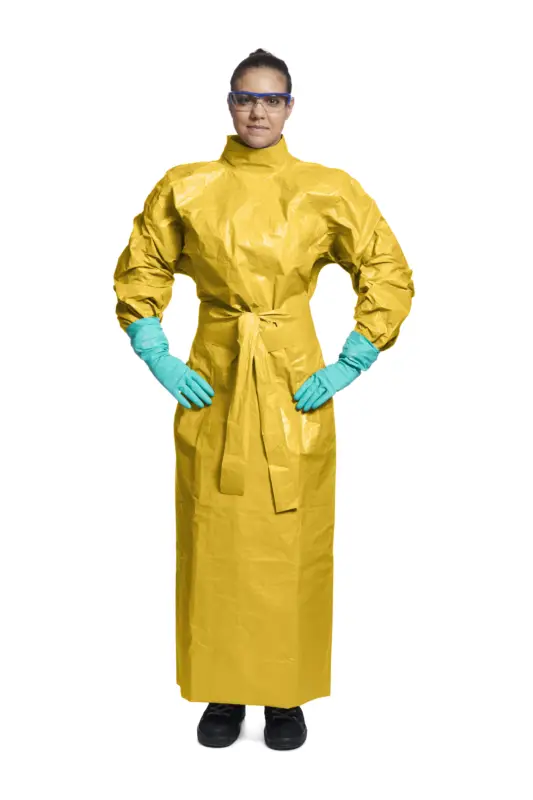 Mouwschort Tychem 2000 C (scheenbeenlengte) met sluiting aan de achterkant, gebreide manchet met dubbel manchetsysteem, mandarijnkraag. Gestikte en overgetapete naden. Beschikbare maten: S / M en L / 2XL. Beschikbare kleuren: Geel. In overeenstemming met: EN14605: 2005 + A1: 2009 (type 3) en EN 14126: 2003.