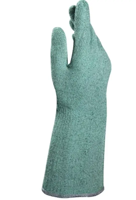Handschoen uit snijbestendige vezels over de hele handschoen, middenste laag in nitril bestendig tegen chemische producten op katoenen drager. Beschermt 37 seconden tegen contacthitte van 100°C en 12 seconden tegen contacthitte van 250°C. Maten: 8,9,10.