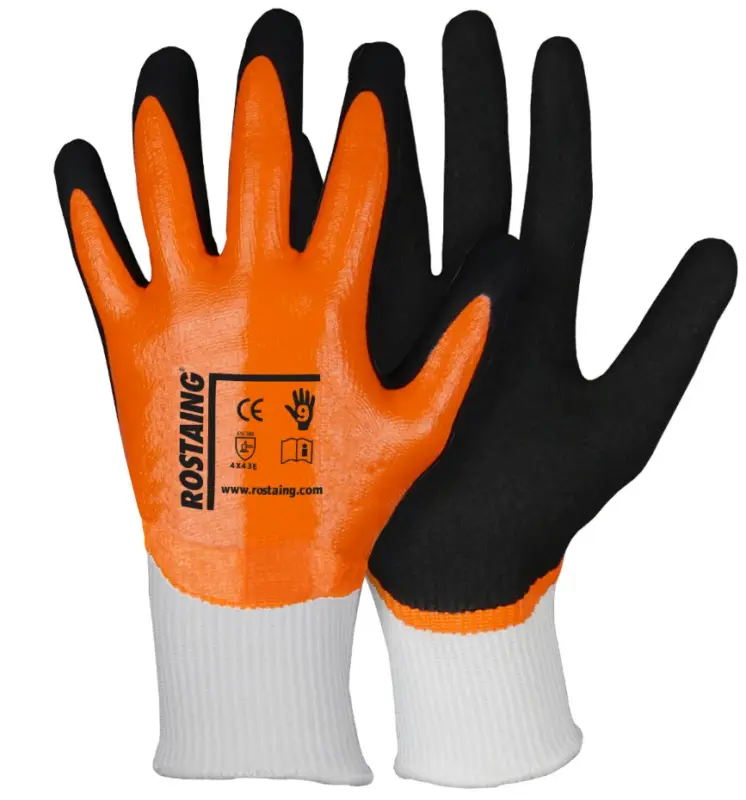 Gebreide handschoen in polyethyleen/composietvezels met dubbele nitrilcoating. De oranje nitrillaag is waterbestendig en bedekt de v olledige hand, de zwarte schuimnitril coating zit enkel op de palm. Maten: 6-11. Geschikt voor assemblage en werkzaamheden in natte of olie-achtige omstandigheden.