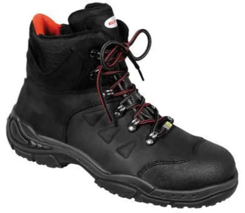 Hoge schoen Till ESD in zwart rundsnerfleder, voorzien van stalen neus en antiperforatiezool. Voering in synthetisch materiaal, binnenzool met fleece overtrokken (ESD). Zool in PU/Rubber, bestand tegen olieën en vetten. Schoen voorzien van een overneus. Maten: 36-48.