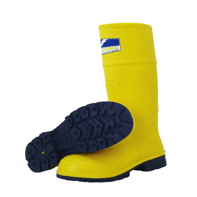 Elektriciteitslaars met epoxy gecoate stalen 200J neus. Voorzien van een oliebestendige en gevulcaniseerde zool in rubber, uiterst slipvast en getest tegen 35000V, energieopname in de hak. Elke laars wordt apart getest tegen 25.000V voor levering. 100% waterbestendig en aanpasbaar in hoogte. Wasbaar tot 40°C. Gemakkelijk aan en uit te trekken door “hands free removal”. Bestand tegen hitte tot 300°C. Voering in polyester, wasbare inlegzool. Moet elk jaar hertest worden. Maten: 35(uk3)/50(uk15.