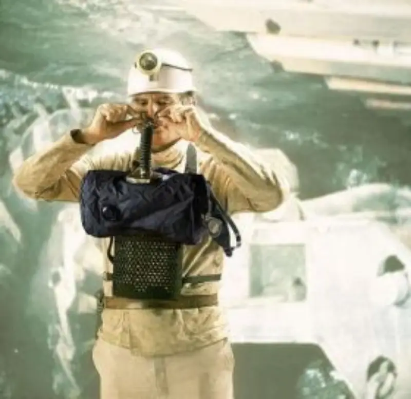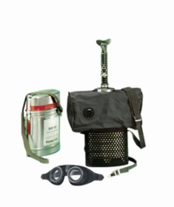 Zelfredder die zuurstof produceert met klem, neusriem en anti-gasbril, voor zeer schadelijke omstandigheden en/of waar zuurstof teko rt kan zijn. Opgeborgen in een hermetisch gesloten, roestvrijstalen draagdoos voorzien van riem om over schouder te dragen. Werking op basis van zuurstofgenererende KO2 cel die na eventueel gebruik te vervangen is. KO2 cel treedt in werking door eerste uitademteug , gaat reageren met vochtigheid en CO2 van uitgeademde lucht. Zeer onderhoudsvriendelijk, enkel jaarlijkse dichtheidstest vereist. G ebruiksduur: minimaal 90 minuten bij verbruik van 30 L/min (vluchten), 300 minuten bij verbruik van 10 L/min (rust). Levensduur: 10 jaar. Gewicht: 4,9 kg.