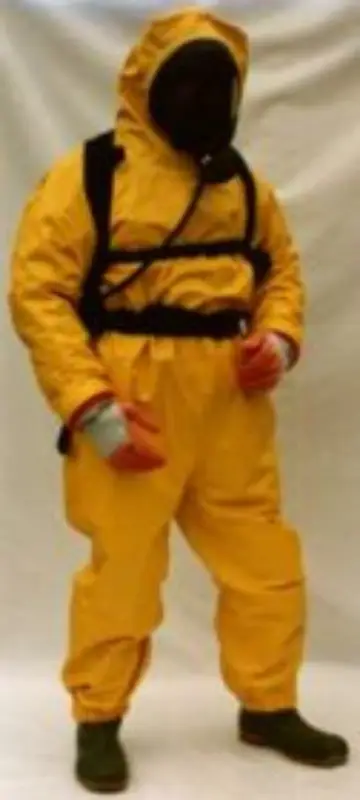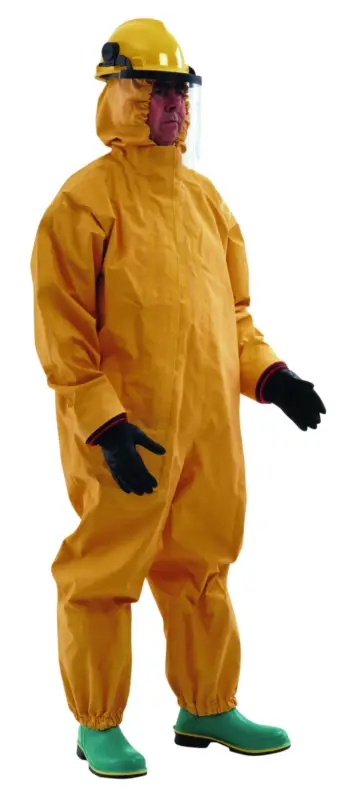 Chemie overall in neopreen. De vaste kap sluit aan door middel van eenelastiek. De schuine rits is voorzien van een dubbele flap met velcro en de mouwen van een dubbele elastiek. De broekspijpen hebben eveneens een dubbele elastiek en een elastiek ter bevestiging onder de voetzool. Beschikbaar in: geel. Maten: M – XL.