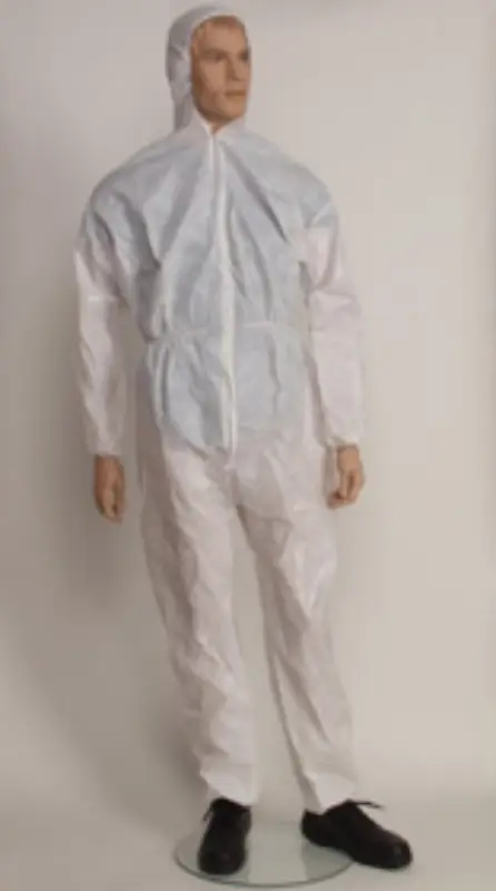 Overall, polypropyleen/polyethyleen met vloeistofdichte coating,elastiek aan polsen en enkels, elastiek in de taille, ritssluiting, kap.Beschikbaar in: wit. Maten: L – XXL.