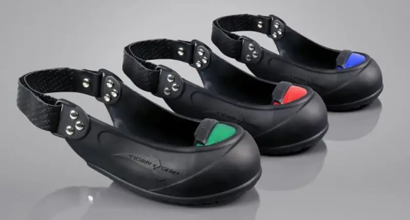 Herbruikbare overschoen in rubber, met een aluminium-titanium beschermneus. Voorzien van een velcro-gesp. Goede antislipzool met Tiger-grip technologie. Bestand tegen koolwaterstoffen. Maten: S (34-38 Blauw), M (39-43 Rood) en L (44-48 Groen).
