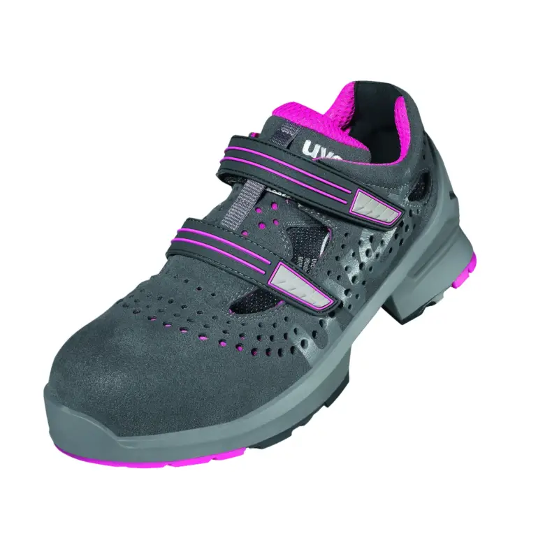 Grijze sandaal, extreem lichtgewicht uit geperforeerd velours met moderne look. Beschikbaar in 2 breedtematen. Voorzien van een velcro sluiting. Met comfortabele inlegzool tegen schimmels en warmte. Loopzool uit PU in 2 lagen: goede abrasieweerstand en snijbestendig. Geschikt voor temperaturen tot 120°C en beantwoordt aan de normen voor ESD. De schoenen laten geen sporen na, hebben een zelfreinigend profiel en bieden een goede resistentie tegen oliën. Maten: 35-43. Breedtematen: 10, 11, 12 en 14.