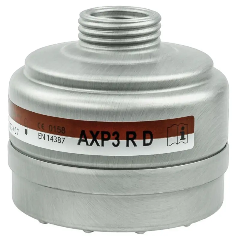 AXP3 schroeffilter DIN 148 in aluminium behuizing. Beschermt tegen organische gassen <(>&<)> dampen met kookpunt lager dan 65°C, toxische stof-, nevel- en rookdeeltjes. Te combineren met volmasker met standaard schroefdraad. Filter slechts 1 maal te gebruiken. Filter van klasse 2: tot max concentratie van 0,5 %.
