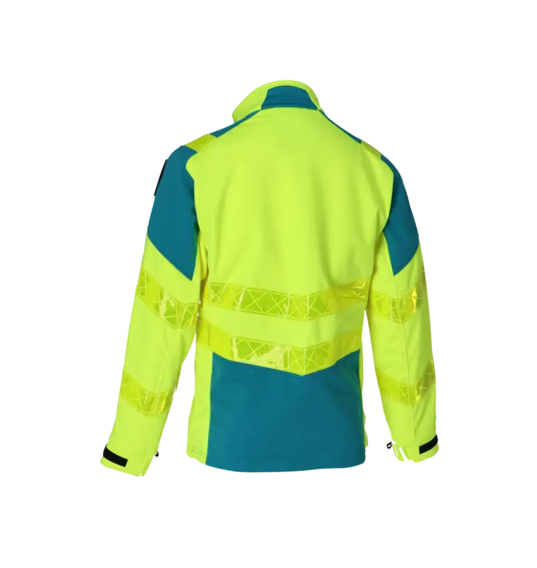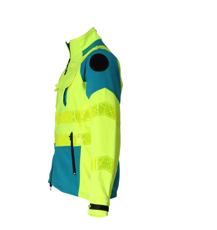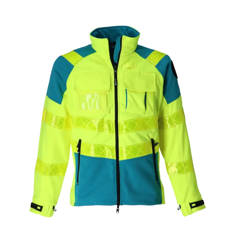 Signalisatie softshell voor ambulanciers met 2 verticale voorzakken, ritssluiting, 1 binnenzak, 1 rechterborstzak, napoleonzak, radiolus en radioazak. Elastische en aanpasbare manchetten, badgehouder op borst, ronde velcro op de mouw voor de zonebadge. Kwaliteit: 100 % polyester + PU coating + fleece, 330 gr/m². Beschikbare maten: XS-5XL. Gele reflecterende prisma banden Beschikbare kleuren: fluogeel/enamel blauw.